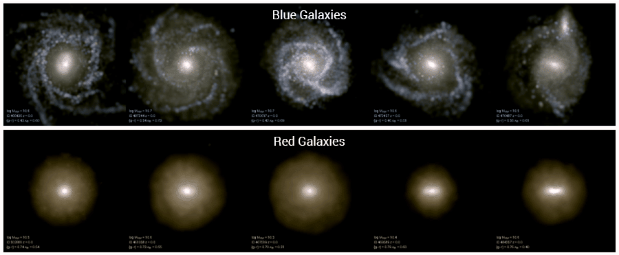 The main reason why some galaxies are red is that their stellar populations are very old and all massive stars, which would contribute to the blue light, have already ceased. This leaves only moderately massive and low-mass stars behind, which cause a red appearance. From a galaxy formation point of view, this can only be achieved if there is no formation of new stars in the galaxy. The gas residing in these galaxies however, has a natural tendency to cool and collapse via gravitational instabilities, which ultimately will lead to the formation of new stars. The key ingredient in the simulation to prevent this from happening are feedback effects from supermassive black holes, which become very efficient at a specific mass scale and drastically reduce star-formation in the massive galaxies. In TNG, the transition to a low accretion state and an associated, highly efficient kinetic wind feedback is key for a sharp transition and the buildup of a bimodal galaxy color distribution. The transition time of galaxies evolving from blue, star-forming to red, quiescent galaxies varies significantly from galaxy to galaxy, with a median of 1.6 Gyr. The high scatter in transition time originates from the diverse paths that individual galaxies take through the color-stellar mass plane, which, alongside with a detailed analysis of the low-redshift galaxy color distribution, is presented in Nelson et al. (2017).