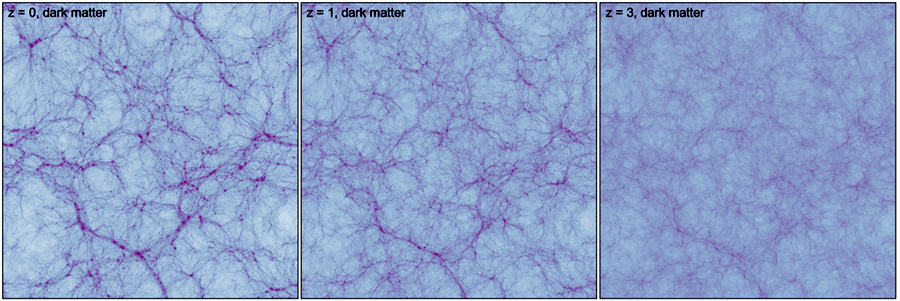Finally, all of the simulations have "dark matter only" counterparts to their "baryonic physics" runs just described. Dark matter only simulations give predictions for how the large scale structure, the clustering of galaxies, the shapes of halos, and so forth would evolve in a Universe constructed only of dark matter. These predictions are useful in part because they are relatively clean, owing to their sole dependence on the gravitational assembly of dark matter halos. However, at the same time, such models fully neglect the important, but uncertain, impact of baryons on the growth of galaxies. Having side-by-side dark matter only and full physics simulations allows us to directly compare and understand the impact that baryon physics has on a broad range of our results.