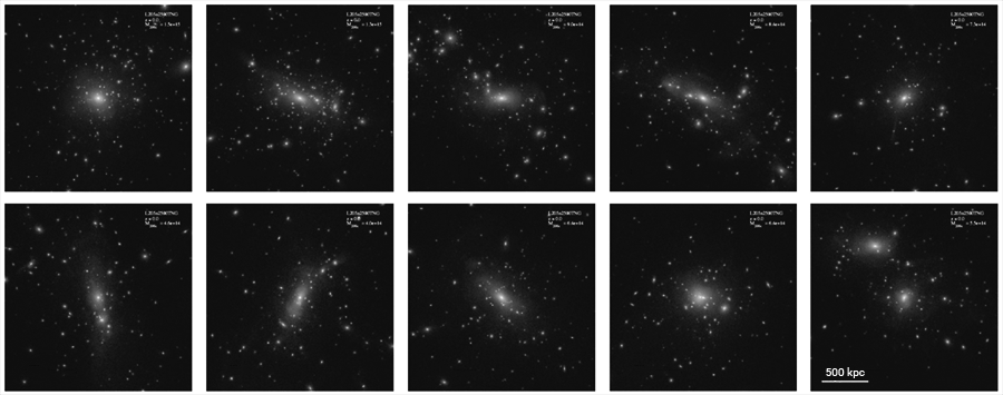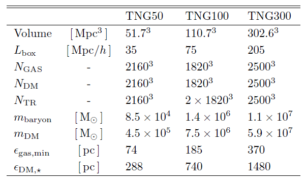 - TNG-Cluster (2023) - a simulation including several hundred massive galaxy clusters, $M_{\rm halo} \sim 10^{15} \rm{M}_\odot$, with the fiducial TNG model, designed to study the physics of the intracluster medium, galaxy evolution in dense environments, and cluster cosmology.