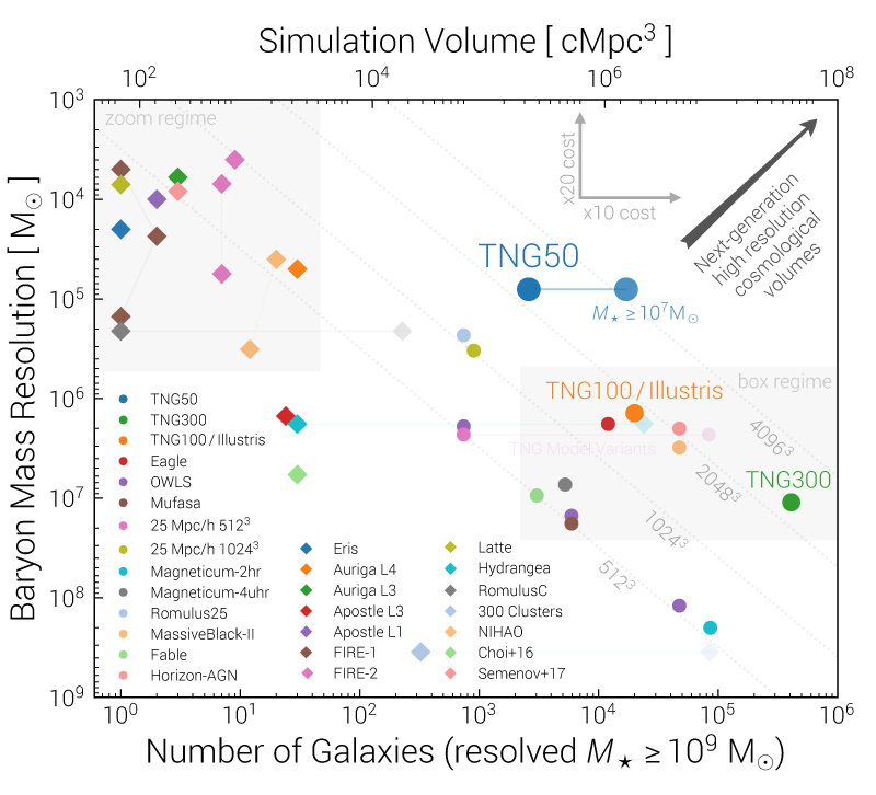 The TNG50 simulation occupies a unique combination of large volume and high resolution, the figure above places it into context. We show TNG50 (dark blue circle) in comparison to other cosmological volumes (circles) and zoom simulation projects (diamonds) at z ~ 0. The x-axis shows an effective volume, given in terms of the total number of resolved galaxies with stellar mass greater than $10^9 M_\odot$. The y-axis shows the resolution, given in terms of the mass of the baryonic mass element. Moving towards the upper right corner represents the frontier for next-generation high-resolution cosmological volume simulations, an extraordinarily intensive computational undertaking which must take advantage of some of the largest supercomputers available.