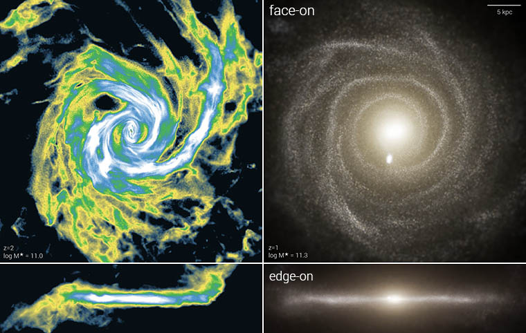 TNG50 is a new class of cosmological volume simulation -- it has been designed to overcome the traditional limitation of compromising volume versus resolution, by simulating a large, fully representative cosmological volume at a resolution which approaches or even exceeds that of modern "zoom" simulations of individual massive galaxies. The simulation realizes a 50 Mpc box sampled by $2160^3$ gas cells, with a corresponding baryon mass of $8 \times 10^4 M_\odot$ (see table above). The median spatial resolution of the star-forming ISM gas is ~100-140 parsecs across cosmic time. It enables us to obtain unparalleled detail, providing a view into the structure, chemo-dynamical evolution, and small-scale properties of galaxies -- the image below shows two massive disk galaxies from the simulation to highlight its ability to resolve internal structural details such as spiral arms, bulges, and nuclear bars, together with the extremely thin scale-heights of galactic disks.