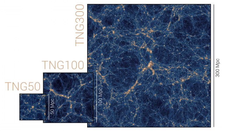 - AIDA-TNG (2025) - "alternative dark matter in the TNG universe", a suite of cosmological magnetohydrodynamical large-volume simulations that simultaneously model galaxy formation physics and different variations of the underlying dark matter model.