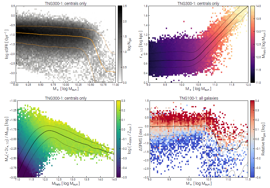 Caption. Four examples of exploratory plots for common scaling relations, galaxy trends, and other relationships between properties of the objects in the group catalogs, galaxies and halos, for TNG300-1 and TNG100-1 at $z=0$. Made using the web-based API functionality. Links into the API for PDF versions of these figures: [upper left], [upper right], [lower left], [lower right].