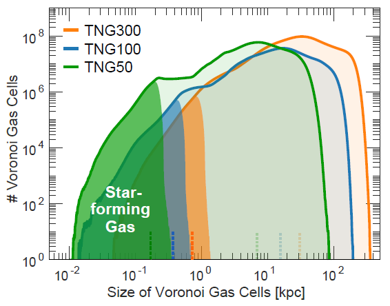 Caption. Spatial resolution of the three high-resolution TNG simulations at $z\sim0$. The dark regions of the distributions highlight star-forming gas inside galaxies, the corresponding median values marked by vertical dotted lines.
