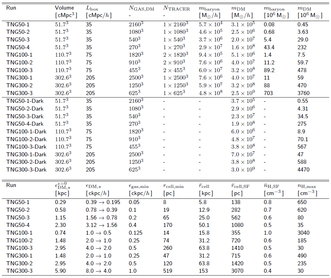Caption. Table of physical and numerical parameters for each of the resolution levels of the three flagship TNG simulations. The physical parameters are: the box volume, the box side-length (note: TNG100 is erroneously reported as 106.5 Mpc in the published table of Nelson+19), the initial number of gas cells, dark matter particles, and Monte Carlo tracer particles. The target baryon mass, dark matter particle mass, z=0 Plummer equivalent gravitational softening of the collisionless component, the same value in comoving units, and the minimum comoving value of the adaptive gas gravitational softenings. Additional measures of the gas resolution, measured at redshift zero: the minimum physical gas cell radius, the median gas cell radius, the mean radius of star-forming gas cells, the mean hydrogen number density of star-forming gas cells, and the maximum hydrogen gas density.