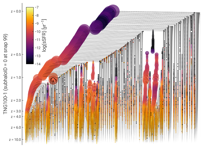 Caption. Example visualization of the complete SubLink merger tree for the most massive halo in TNG100-1 at z=0. Here tree node size is scaled with total halo mass and color mapped to sSFR.