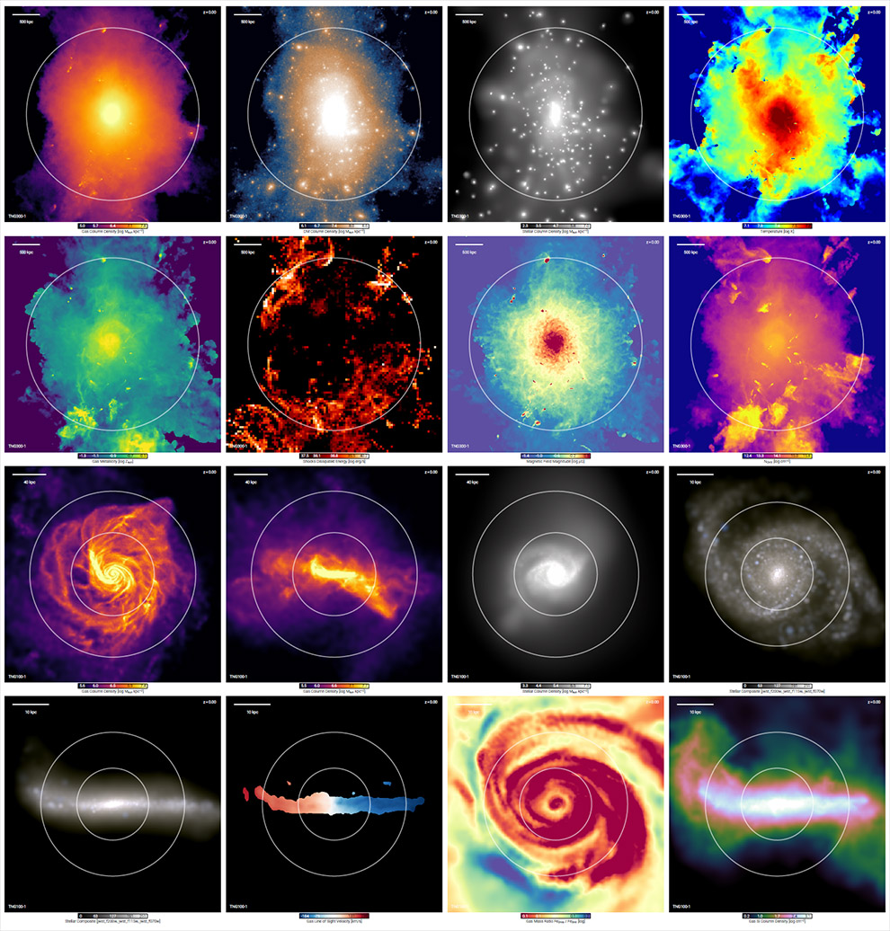 All of the observational validations and early results from TNG100 and TNG300 demonstrate the broad applications of the IllustrisTNG simulations. To give a sense of the expansive scope of these simulations, and the potential for wide applications across many areas of galaxy formation and cosmology, the Figure below visualizes the TNG100 simulation at redshift zero. Each slice reveals a view into the synthetic IllustrisTNG universe. Together, they range from purely theoretical quantities to directly observable signatures, spanning across the baryonic and non-baryonic matter components of the simulation: from dark matter, to stars, to cosmic gas. The wealth of available information in the simulation outputs translates directly into the wide range of astrophysical phenomena which can be explored with the TNG simulations.