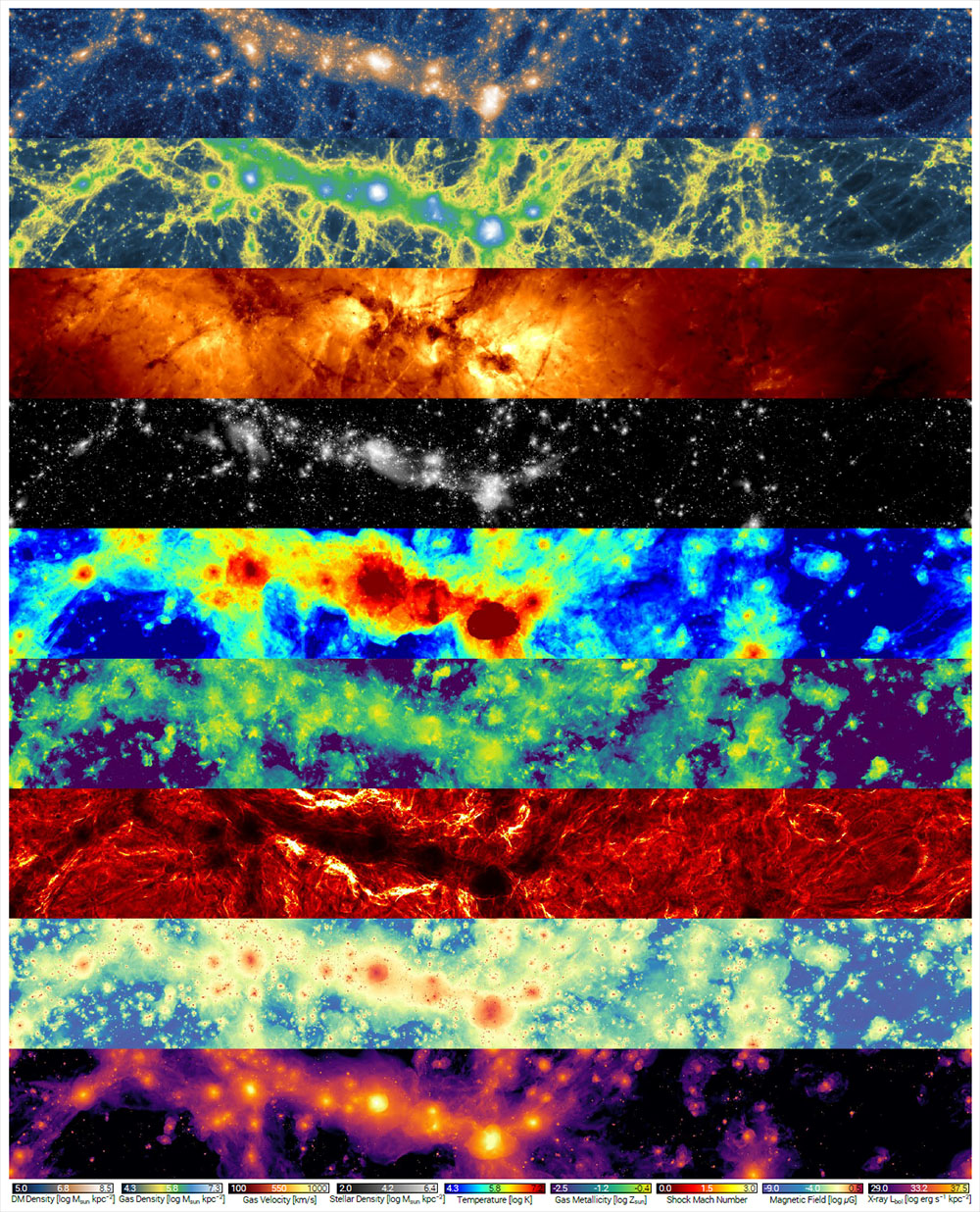 Caption. Overview of the variety of physical information accessible in the different matter components of the TNG simulations. From top to bottom: dark matter density, gas density, gas velocity field, stellar mass density, gas temperature, gas-phase metallicity, shock mach number, magnetic field strength, and x-ray luminosity. Each panel shows the same $\sim 110 \times 14 \times 37$ Mpc volume of TNG100-1 at $z=0$.