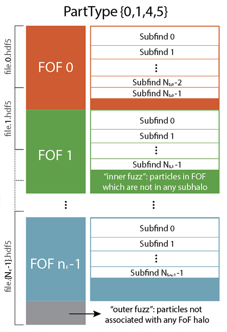 Caption. Schematic diagram of the organization of particle/cell data within the snapshots for a single particle type. Within a type, particle order is determined by a global sort of the following fields in this order: FoF group number, Subfind subhalo number, binding energy, nearest FoF group number. This implies that FOF halos are contiguous, although they can span file chunks. Subfind subhalos are only contiguous within a single group, being separated between groups by an "inner fuzz" of all FOF particles not bound to any subhalo. Here $N_c$ indicates the number of file chunks, $n_F$ the number of FOF groups, and $N_{S,j}$ the number of subhalos in $j^{\rm th}$ FoF group.