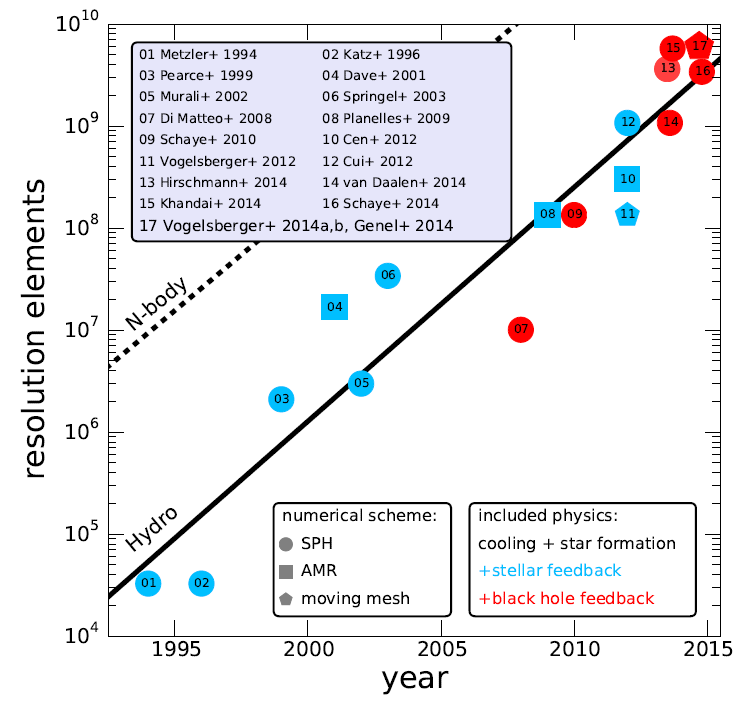 (3) The Genel et al. (2014) comparison of cosmological hydrodynamical simulations, in terms of the total number of resolution elements (particles), versus year: