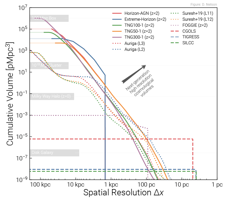 (2) A comparison of spatial resolution, in terms of the total volume (y-axis) simulated at a given resolution $\Delta x$ or better (x-axis). Periodic boxes (solid) are compared against individual zooms and CGM-refined zooms (dotted) and idealized small-scale simulations (dashed):