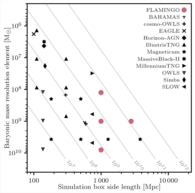 (4) The Schaye et al. (2023) comparison of cosmological hydrodynamical simulations, in terms of baryon mass resolution versus simulated volume: