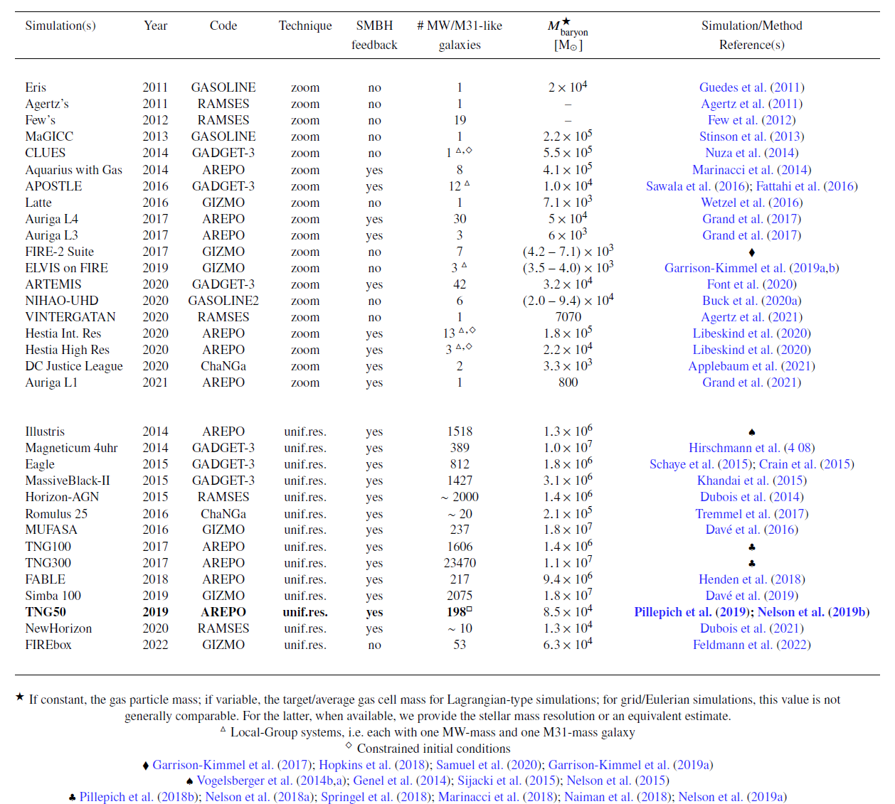 Cosmological (magneto-)hydrodynamical simulations of MW/M31-like galaxies or Local Group-like (LG) systems in a $\Lambda\rm{CDM}$ scenario} currently pursued by the community. The list deliberately omits idealized and isolated-disk simulations, dark-matter only simulations -- even if they have paved the road for the subsequent hydrodynamical ones, especially in the context of MW-mass haloes --, and cosmological simulations with too poor resolution for galaxies and their stellar disks to be studied. Namely, here we include only cosmological models, i.e. simulations that start from cosmologically-motivated initial conditions on $\gg$ 10s Mpc scales, which are run to $z=0$. We hence also list large-volume uniform-resolution projects (specifically those with baryonic mass resolution better than a few $10^7 \rm{M}_\odot$), as they naturally include MW/M31-mass galaxies.