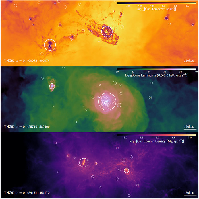 In Pillepich+ (2024) we identified three pairs of galaxies in TNG50 which resemble the Local Group. The SubhaloIDs of the LG-like pairs are: 400973+400974; 425719+580406; and 454171+454172, which are pictured below in gas temperature, X-ray emission, and gas column density projections, respectively.