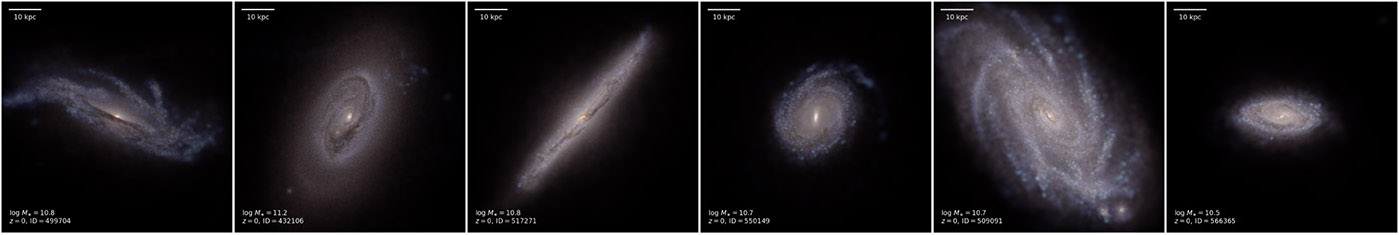 We also highlight six galaxies as our closest Milky Way analogs. These are Subhalo IDs 516101, 535774, 538905, 550149, 552581, and 566365. We also highlight one galaxy as our closest Andromeda analog, with Subhalo ID 432106. In all cases, their stellar disk properties, including disk lengths and total stellar mass, are within the observational estimates for the Galaxy and M31, respectively.