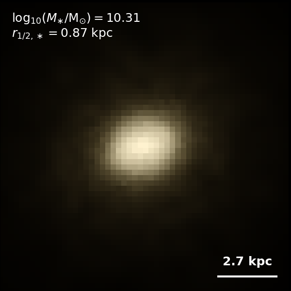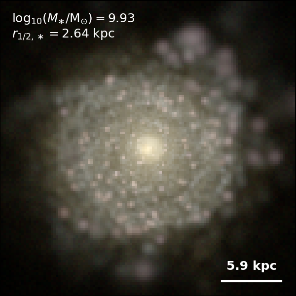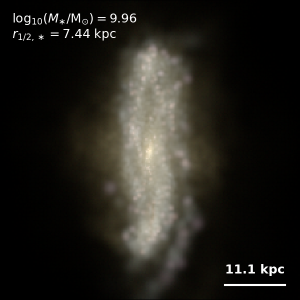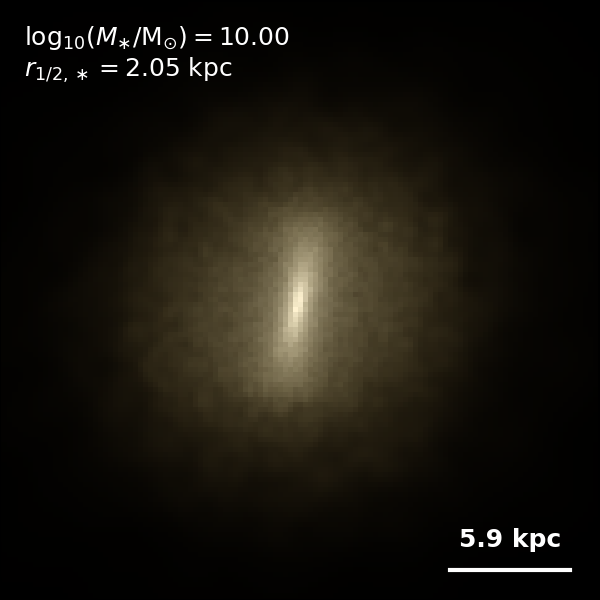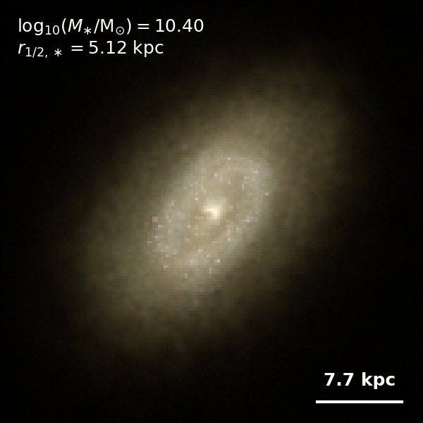 These figures are similar to Figs 3 and 4 from Rodriguez-Gomez+ (2019), but in this case we extend the analysis (originally for TNG100) to the highly detailed TNG50 simulation. Here we show idealized synthetic images (using Pan-STARRS1 g,r,i filters) of randomly selected galaxies from the TNG50 simulation, generated with the SKIRT radiative transfer code. The text labels indicate the total stellar mass and the 3D stellar half-mass radius.