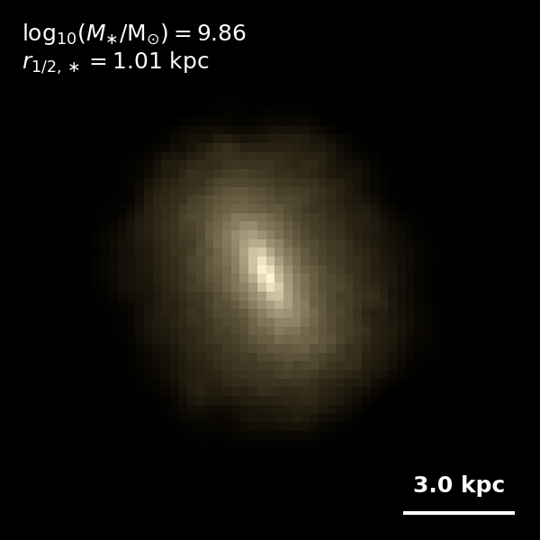 These figures are similar to Figs 3 and 4 from Rodriguez-Gomez+ (2019), but in this case we extend the analysis (originally for TNG100) to the highly detailed TNG50 simulation. Here we show idealized synthetic images (using Pan-STARRS1 g,r,i filters) of randomly selected galaxies from the TNG50 simulation, generated with the SKIRT radiative transfer code. The text labels indicate the total stellar mass and the 3D stellar half-mass radius.