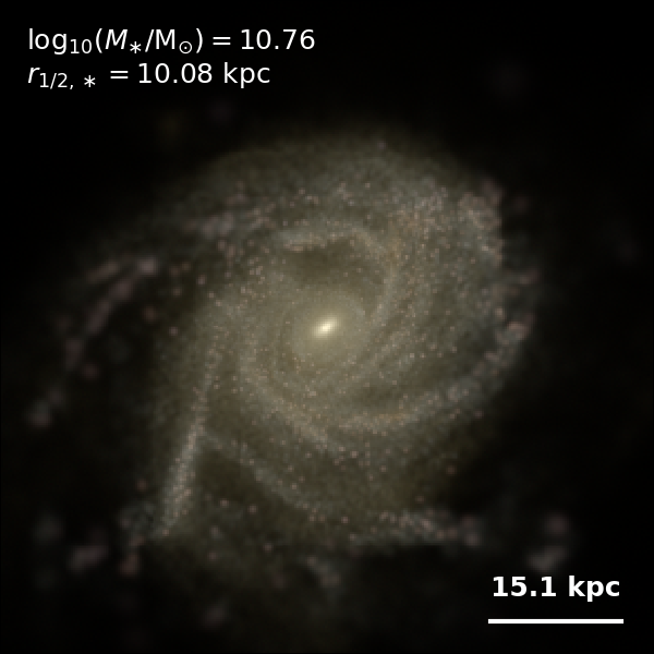These figures are similar to Figs 3 and 4 from Rodriguez-Gomez+ (2019), but in this case we extend the analysis (originally for TNG100) to the highly detailed TNG50 simulation. Here we show idealized synthetic images (using Pan-STARRS1 g,r,i filters) of randomly selected galaxies from the TNG50 simulation, generated with the SKIRT radiative transfer code. The text labels indicate the total stellar mass and the 3D stellar half-mass radius.