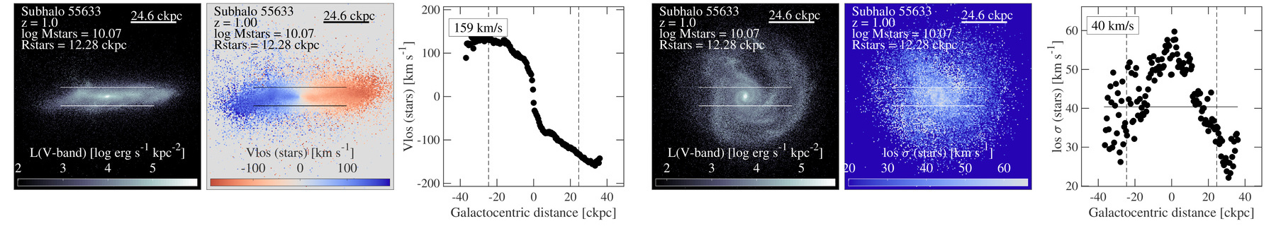 V-band light maps, velocity maps and velocity profiles for the stellar component of random galaxies, from the TNG50 simulation, as in Figure 10 of Pillepich+ (2019). Galaxies with stellar mass above 1010 solar masses are shown at z=1 and z=2. In the three leftmost panels, we show edge-on projections of the stellar light and mean line-of-sight velocity, in addition to the radial profiles of the mean line-of-sight velocity along the slit depicted by the white solid lines. In the three rightmost panels, we show the face-on projections of the stellar light and of the line-of-sight velocity dispersion, in addition to the average velocity dispersion profiles along the slit. We always pixelize using square pixels of 0.5 comoving kpc to a side. For each galaxy, two numbers are indicated in the panels: stellar rotation velocity (Vrot) and stellar dispersion (sigma).