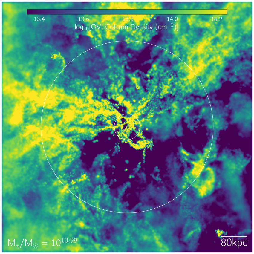 These images are similar to Figures 2 and 3 of Ramesh+ (2023a). They visualize the physical properties of the gaseous halos surrounding Milky Way/M31-like galaxies in TNG50, at redshift zero. These views of the circumgalactic medium (CGM) are all shown on the scale of the virial radius of the parent dark matter halo (largest white circle). Note that satellite galaxies are intentionally excluded! Each galaxy in this sample of 198 is shown eight times, visualizing: gas column density, temperature, thermal pressure, entropy, HI column density, metallicity, OVI column density, and x-ray luminosity. You can zoom out, in the web browser, to fit more images on the screen at once. Note that eight of these galaxies are in fact satellites themselves.
