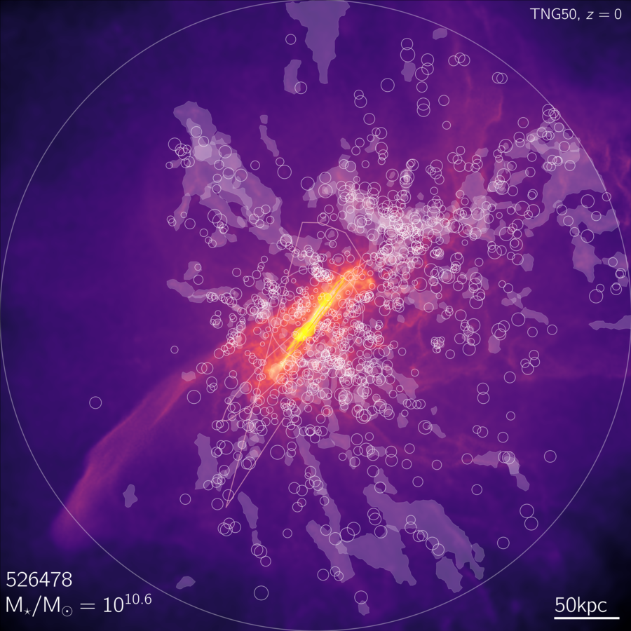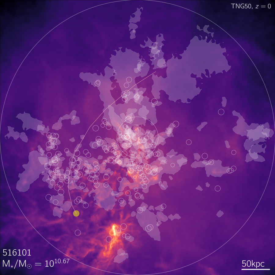 These images follow Figure 2 of Ramesh+ (2023b), and visualize the gaseous halos surrounding Milky Way-like galaxies in TNG50, at redshift zero. These views of the circumgalactic medium (CGM) are shown on the scale of the virial radius of the parent dark matter halo (largest white circle). The white shapes show the actual location, and morphology, of large cold clouds identified in the CGM, while white circles show the locations and sizes of smaller cold clouds (with total masses less than 5x105 Msun). The background map shows the gas column density projection, and the yellow markers and lines show the positions of the three most massive satellites with baryon fraction at least 10%, if available, and their past orbits. Each galaxy in this sample of 132 is shown three times, from three different projection directions.