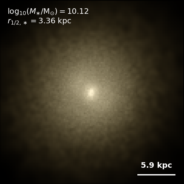 These figures are similar to Figs 3 and 4 from Rodriguez-Gomez+ (2019), but in this case we extend the analysis (originally for TNG100) to the highly detailed TNG50 simulation. Here we show idealized synthetic images (using Pan-STARRS1 g,r,i filters) of randomly selected galaxies from the TNG50 simulation, generated with the SKIRT radiative transfer code. The text labels indicate the total stellar mass and the 3D stellar half-mass radius.