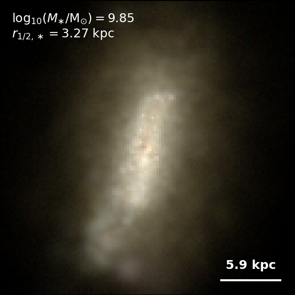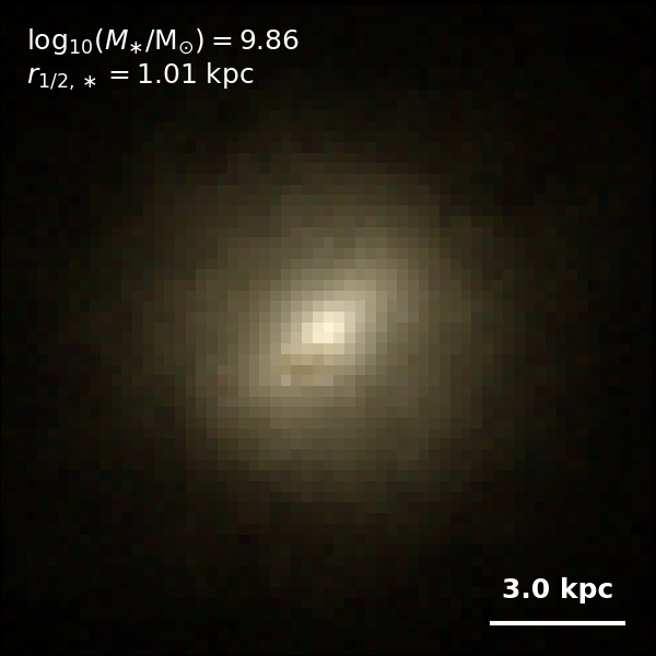 These figures are similar to Figs 3 and 4 from Rodriguez-Gomez+ (2019), but in this case we extend the analysis (originally for TNG100) to the highly detailed TNG50 simulation. Here we show idealized synthetic images (using Pan-STARRS1 g,r,i filters) of randomly selected galaxies from the TNG50 simulation, generated with the SKIRT radiative transfer code. The text labels indicate the total stellar mass and the 3D stellar half-mass radius.